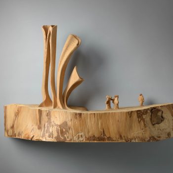 Intuitiv arbeite ich, ein exponierter Hinterkopf, das Gesicht, Hände, Füße, die Figuren führen ein Dialog mit dem Sprach – Hörrohre oben hin größer, zum Boden hin verjüngern Sie sich selbst.
